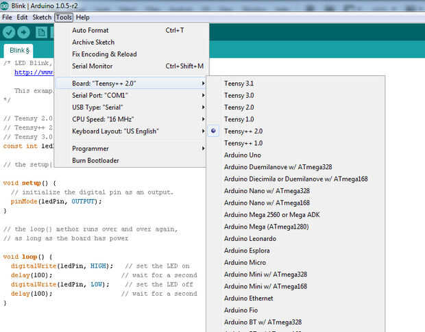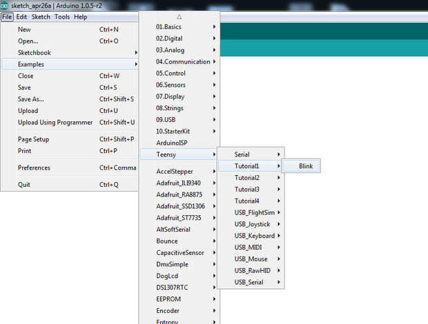 Abra la versión de Arduino que acabas de descargar. Ir a archivo -> ejemplos -> Teensy -> Tutorial1 -> Blink (ver imagen).
