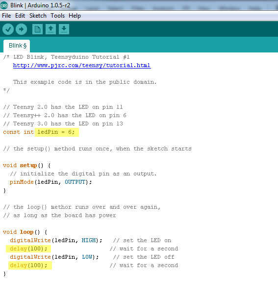 Editar el esbozo de blink. Usted necesitará cambiar el 'ledPin' a 6 y el 'retraso' a 100. (ver imagen).