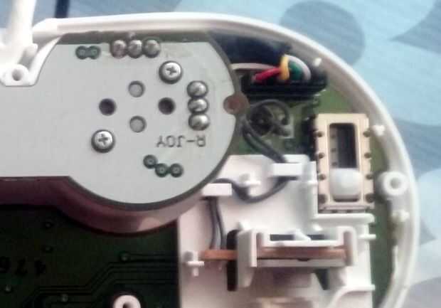 Después quité el cable del controlador. Se conectan los cinco cables arriba (rojo, amarillo, verde, blanco y negro) en un puente de plástico de la carcasa. Destornilla la placa de circuito de la caja de control y lo volcó que para desoldar todos los cinco cables, quitando el puente entero y dejando sólo el desnudo circuito para conectar cables nuevos para.