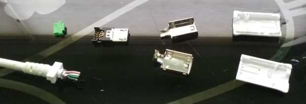 Usé un viejo teléfono de Samsung USB cable como esta que es apropiadamente blanco para que coincida con el controlador. Que dividido abierto el lado micro-B con un módulo x-acto. Después de quitar la carcasa de plástico, el escudo de metal y las piezas de conector, yo cuidadosamente había despojado una pequeña cantidad de aislamiento de cada uno de los cuatro cables. El extremo restante del cable se adapta muy bien a través del orificio dejado por el botón puerto de accesorios. El bloque rectangular en el extremo mantiene convenientemente el cable de tracción en las conexiones soldadas.