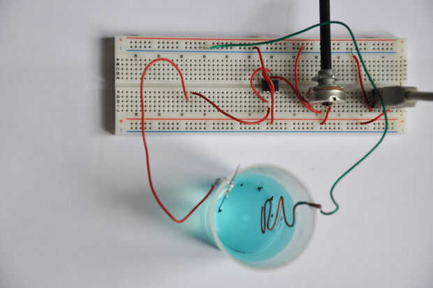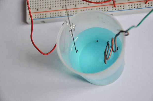 Pruebas anteriores con una punta de lápiz grande eran absolutamente acertadas. (a 1,8 V en una solución de sulfato de cobre)
