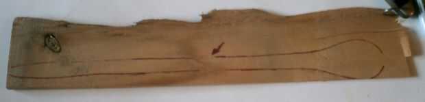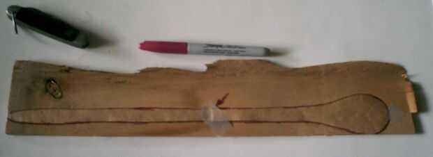 Un fabricante de flecha de Tejas tradicionales se sentarse en un porche y gradualmente una flecha a mano alzada, pero puede ser más prudente y metódico, especialmente como un principiante. Acababa de usar algunos marrón barato "papel de carnicero" que viene en un tamaño grande, pero quizá quieras cinta dos hojas de papel cuadriculado para ayudar a hacer líneas rectas y la simetría perfecta. Supongo que no necesitas saber dibujar y cortar un patrón. 8) también, espero que no tener que señalar que el extremo puntiagudo del patrón flecha va en el extremo grueso de la madera, y la cola ancha va en la parte fina de la madera, así que será como las plumas de una flecha normal. Puede fijar el patrón a la madera (arte y hobby tiendas tienen pines diseñados para este tipo de cosas), pero sólo usé unos pedazos de cinta. Rescató una sección de tejas que tenía un nudo en un lado y las grietas en el extremo fino, colocar el patrón en el lado bueno y acortar un poco el diseño con un Z-fold (grabado abajo, vea la flecha). Una vez que el patrón se fija temporalmente a la madera, puede trazar su contorno con cualquier marcador. Si utiliza cinta, habrá zonas que no conseguir, usted puede conectar fácilmente las líneas, pero estas pequeñas lagunas no deberían ser un problema.