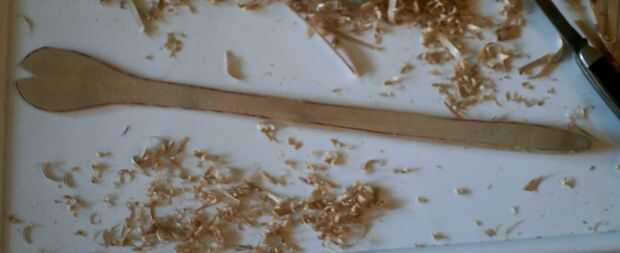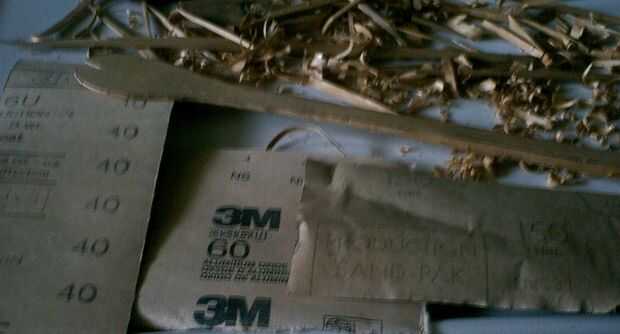 Para obtener una flecha que parece fue hecha por una persona de oficios y no un cochino descuidado, utilice su cuchillo cuidadosamente afeitado hasta el patrón. Tenga en cuenta las virutas de poco en la imagen. También recomiendo lijar a mano, utilizando dos o tres grados de papel de lija. La demostración de ejemplos aquí son justo lo que me ha pasado que tienen a la mano; no necesita usar tres, y no tienen que ser estas particulares grados. Por otro lado, puede ir más allá y acabar con un papel de esmeril muy fina o lana de acero. Sólo asegúrese de hacer un trabajo minucioso con un grado antes de pasar a un grado más fino. Una pieza suavemente lijada de buena madera es una cosa de belleza.