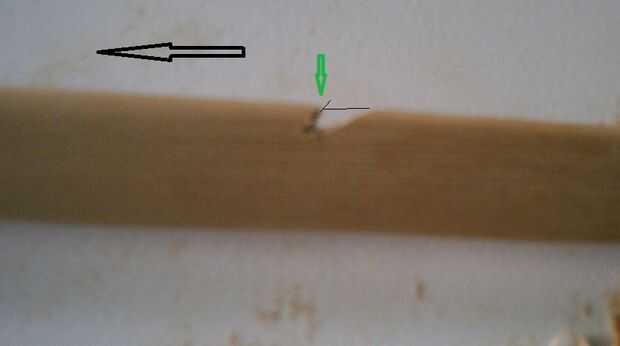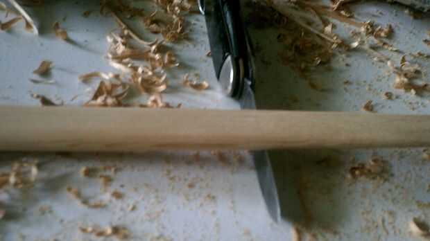 El último paso que forma es tallar en la muesca. Usted debe colocar en o justo antes del punto de equilibrio. No tienes que ser quisquilloso y utilice una hoja de cuchillo; sólo puede equilibrar en su dedo. No creo que la ubicación exacta hace que mucha diferencia, pero usted conseguirá algunos extraños, resultados decepcionantes (y posiblemente peligrosos) si usted hace la muesca demasiado lejos hacia adelante o hacia atrás. Por supuesto, también puede hacer su patrón con un pequeño gancho que se pega hacia fuera, pero además de romper con la tradición, requiere más trabajo y podría romperse o cuando usted está tallado alrededor de él o cuando usted lo utiliza. Siempre he utilizado un nudo simple para atrapar en la muesca, pero he leído de gente que hace un bucle en la cadena.