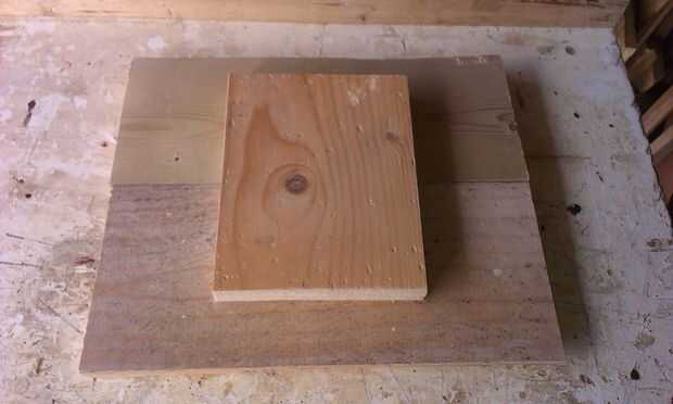 Para la parte inferior, una vez que se puede ver qué tan grande será los azulejos, encuentra o cortar un trozo de madera del mismo tamaño que la principal parte plana de la teja. Para obtener un pedazo más grande de madera para clavar en como se muestra en la segunda foto. Asegúrese de que las uñas que se utiliza no ven por el otro lado ya que pueden perforar la lata cuando lo pulsa. La pieza en el centro debe ser un poco más larga que la altura de la lata para que lo se todo ser moldeado.