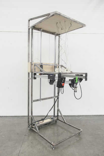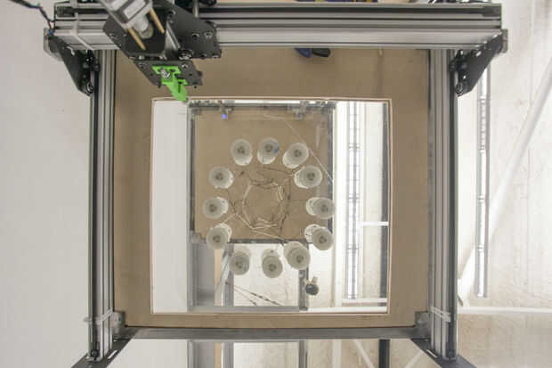 Tejedor de espacio está diseñado para crear estructuras de tejido ultra ligeras con materiales fibrosos. Utiliza un sistema de 3 ejes pórtico, tejidas formas se crean en un proceso similar como la mayoría de las impresoras 3D, excepto producir una significativamente mayor relación resistencia-peso, producir cero residuos y no requieren ningún material de apoyo. En Resumen, espacio Weaver es una impresora 3D de siete pies de altura que utiliza fibra de carbono y fibra de vidrio para imprimir estructuras de tejido de cinco pies de altura.