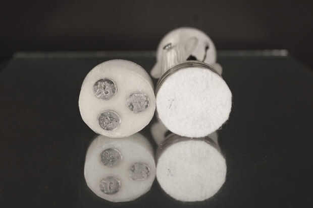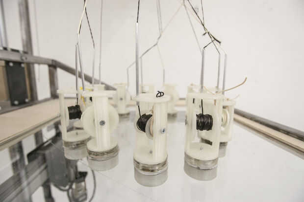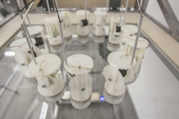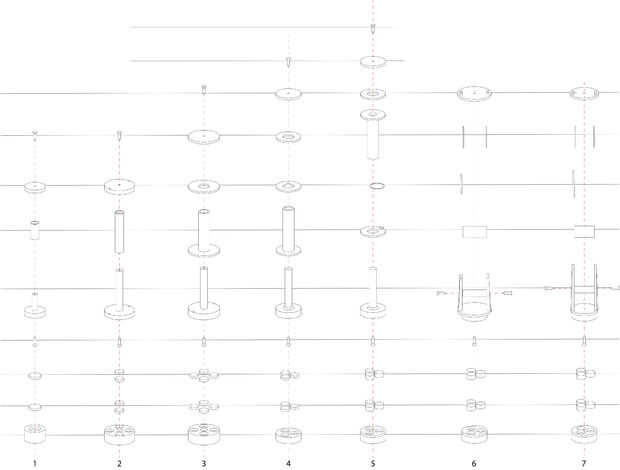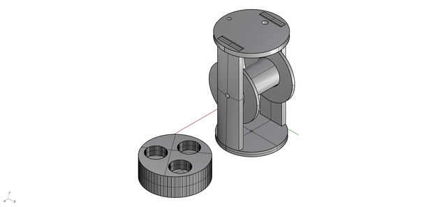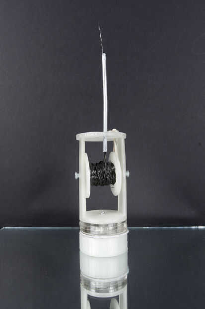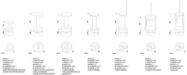 Diseño de carrete resultó para ser difícil para esta máquina, y a través del curso del semestre nos fuimos a través de numerosos diseños diferentes. A través de la experimentación, descubrimos que el verdadero desafío era crear un carrete que se desenrolle libremente como la máquina bajada, mientras que no relajarse bajo tensión durante el proceso de tejido. El tubo de aluminio ayuda a reducir algunas de esta tensión, y la orientación de la bobina (un axel horizontal) permite una acción suave e incluso desenrollar en la dirección Z. Una banda de caucho se agrega a cada carrete para permitir un método de ajuste a la tensión del carrete. La banda de goma envuelve la bobina en la parte superior de la compañía hilo de rosca. Cada carrete utiliza seis imanes de neodimio ½ "x ¼" disco. Tres se encuentran en la bobina sí mismo y otros tres en la base (bajo vidrio). Cada carrete era 3D impreso en PLA en una impresora Flash forjar, con un láser tres-capa base de acrílico.