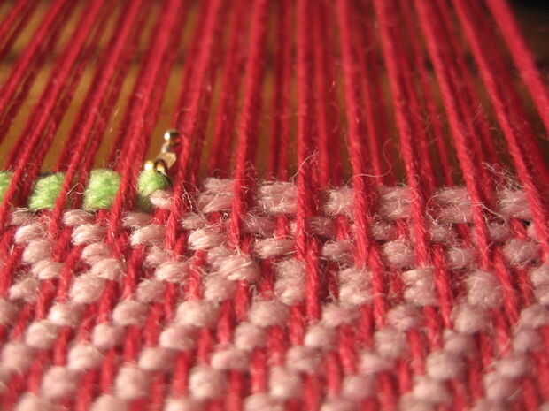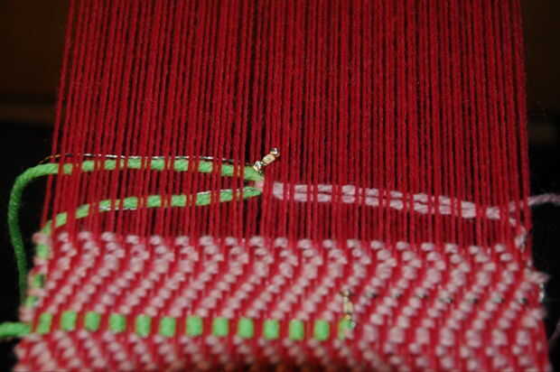 Tejer una trama agarrada trayendo el hilo rosa de la derecha y el greenyarn/conductivethread del lado izquierdo.