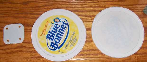 Rebusqué por el sótano anoche y me encontré las tapas margarina tina (el tamaño de 2qt) y aunque es bastante resistente y hará el truco en un apuro, quería algo un poco más fuerte y menos propenso a la flexión mientras que todavía siendo bastante fácil de cortar con un buen par de tijeras.