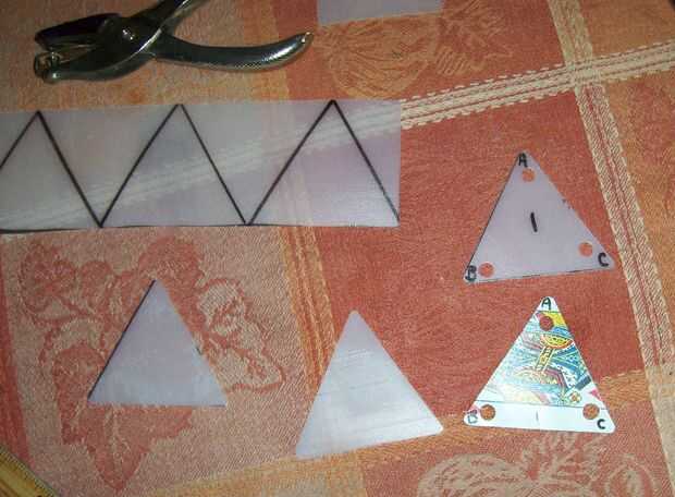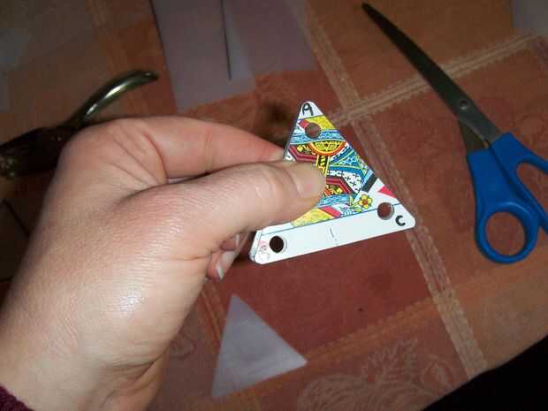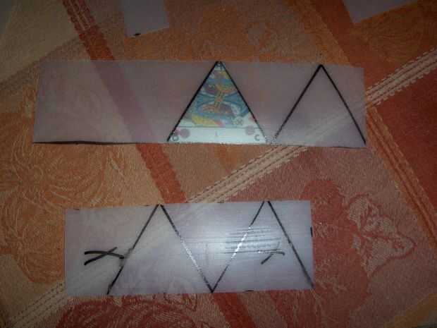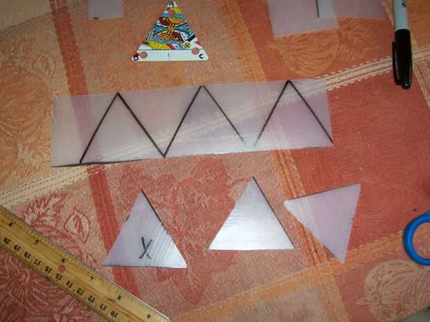 Las imágenes de las plantillas de la tapa de la margarina y las imágenes de cómo hacer los recortes de triángulo con los restos de mi, completan con perforación del agujero. Sólo coloco los trozos sobre la parte superior de un triángulo de Pinacle hice previamente y marcar distancia! Medir los lados de las tarjetas de triángulo terminado 2-1/2".