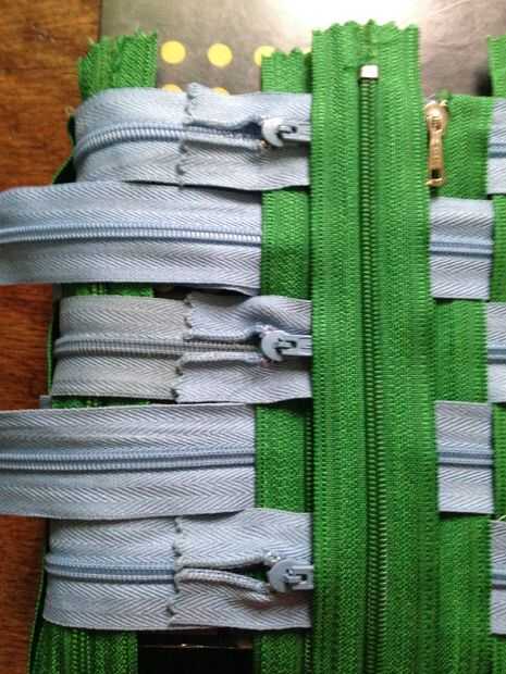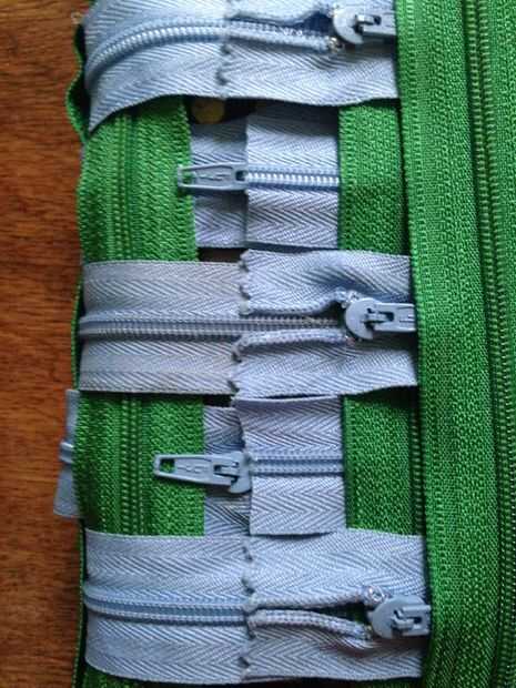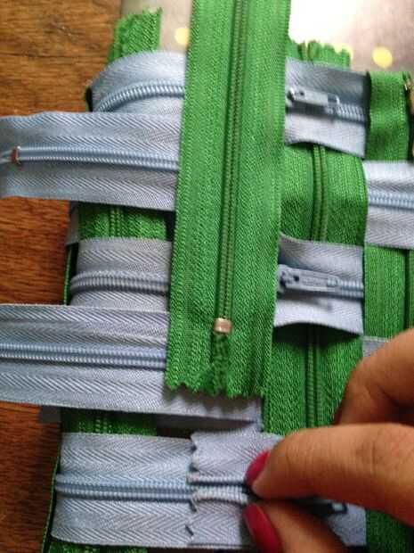 Pegamento en los lados de la bolsa justo como lo de tejer. Corte una porción media de la cremallera larga y cola también. Este producto final se verá como figura.
