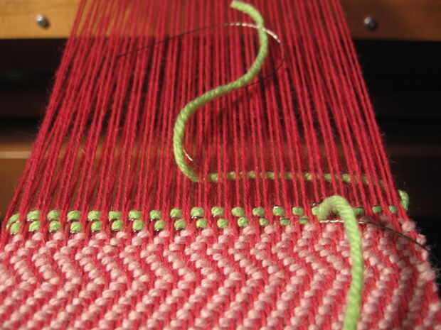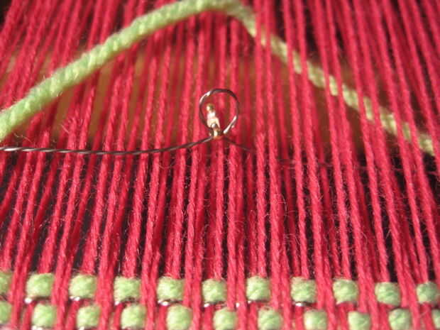 Tejer el rastro negativo - en mi ejemplo es la fibra verde + hilo conductor El LED en el hilo conductor de la alimentación Apriete el nudo en el hilo conductor El LED de la posición en la estructura de la armadura Batir suavemente la urdimbre. Acabado de tejer la hilera
