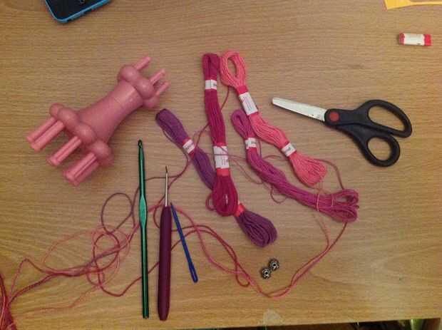 Necesita un tejido telar como se muestra en la imagen (vamos a usar la parte con cinco clavijas). Usted también necesitará cuatro madejas de hilo de bordar, una cinta métrica, tijeras, una aguja, el gancho de tejer y una aguja de ganchillo. También puede utilizar granos u otros adorno cuando haya terminado.