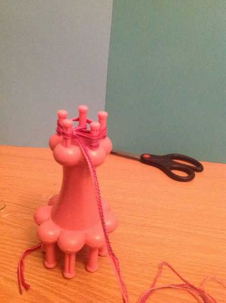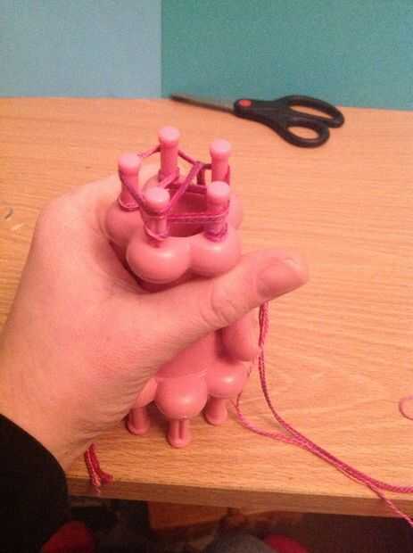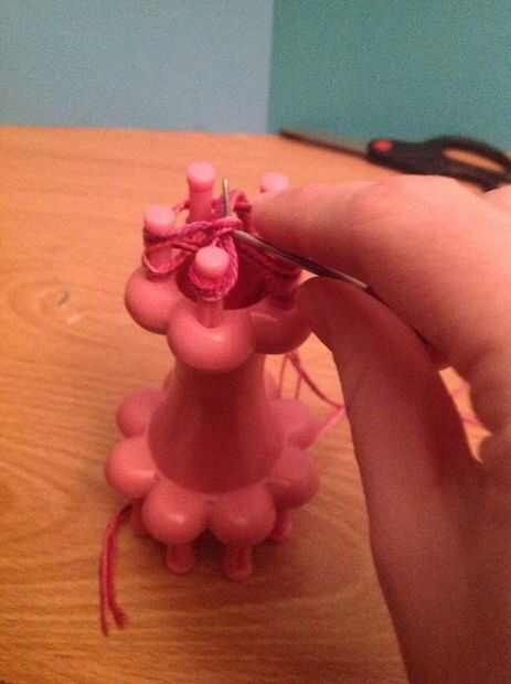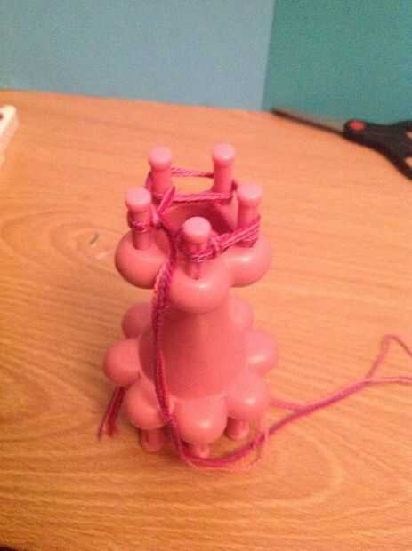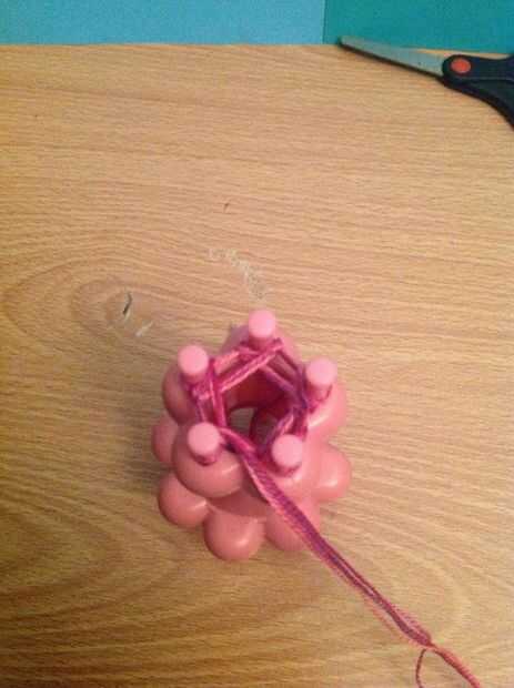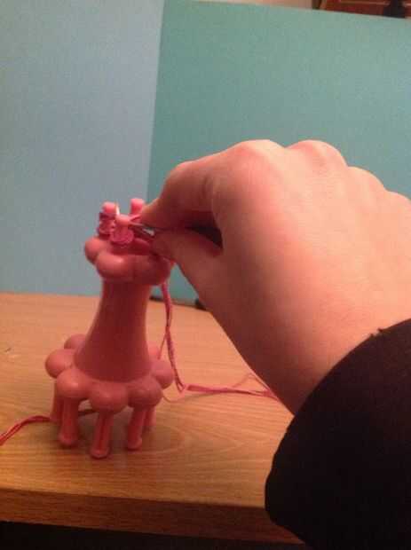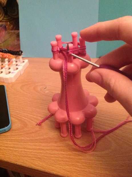 Ahora toma tu gancho y empezar a tirar el lazo inferior sobre la parte superior, a partir de la clavija que último fue envuelto. Una vez que lazo su primer peg puede mover la cadena de trabajo al lado.