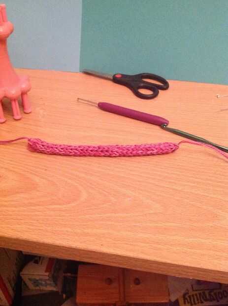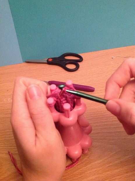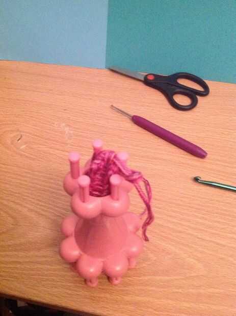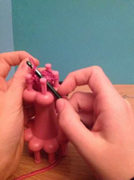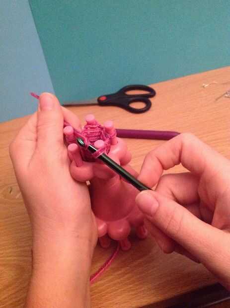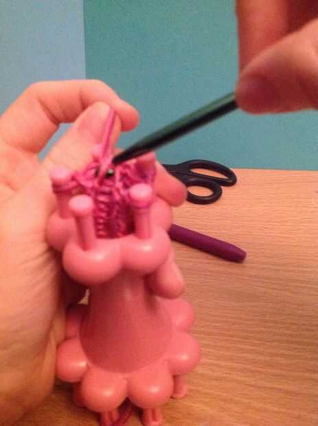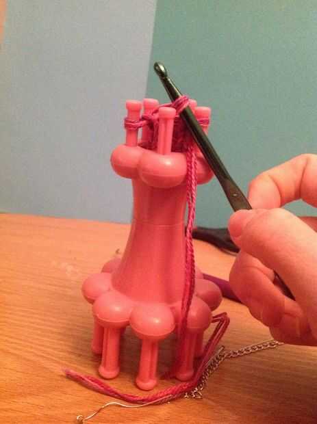 Insertar el ganchillo en el lazo en la clavija que acaba de terminar. Tienes que tirar del extremo de la cuerda por el bucle. Ahora usted puede tomar ese lazo de la clavija. Hacer lo mismo con el resto de los bucles.