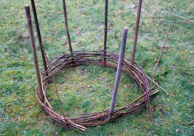 Después de haber suministrado algunos palos gruesos, rectos, que servirán como marco para nuestra cama elevada (o cerca), tienes que elegir el tamaño y la forma de su tejido algo: la longitud de los sticks define la altura, la distancia y posición de la forma y el tamaño de la cama (o cerca). Como ya dije, podría ser un poco más difícil tejer una valla recta, ya que se pierde cierta firmeza, si tejen linealmente.
