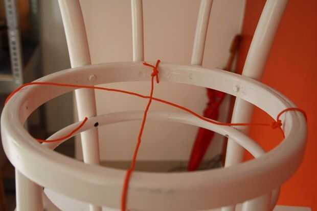 Tire del hilo por los agujeros y la grapa en la parte inferior. Si no tienes una pistola de grapas, pueden martillo de clavos pequeños y atar el hilo alrededor de él. Después de hecho un nudo alrededor de la uña, martillo en el clavo totalmente.