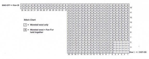 Fila 20: BO ambos hilos. Clip de hilados, dejando una cola de 8 pulgadas de lana para coser y una cola más corta de piel divertido tejer en más adelante.