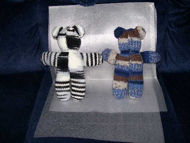 La parte posterior del osos con costura trasera. Costura de la pierna está en el centro (entre las piernas). Oso blanco y negro muestra cómo varigation cambia entre el frente y hacia atrás al hacer punto plano.