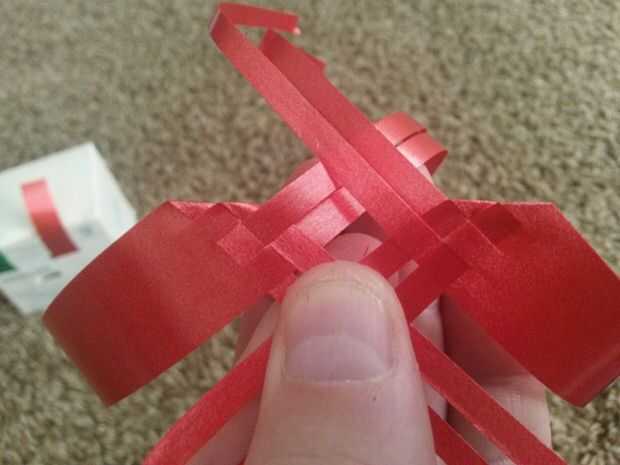 Ahora doblar la tira siguiente del mismo modo. Si usted dobla la primera tira en hacer lo mismo con el siguiente. Si la primera fue en entonces el segundo será sobre también. Luego tejer éste a través de los dos últimos, va lo contrario como el primero. Si la primera tira fue sobre la tira siguiente tome esta bajo, luego lo contrario en la siguiente tira.