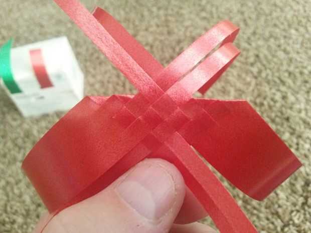 Una vez que cada cinta tiene dos tiras tejieron a través de los demás, para que queden dos tiras adelante y dos atrás acentuado con tejer las dos cintas juntas.