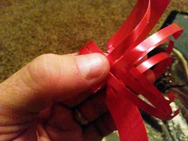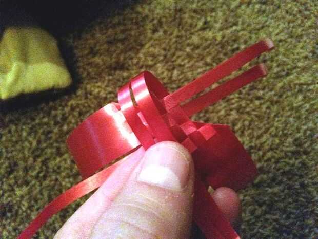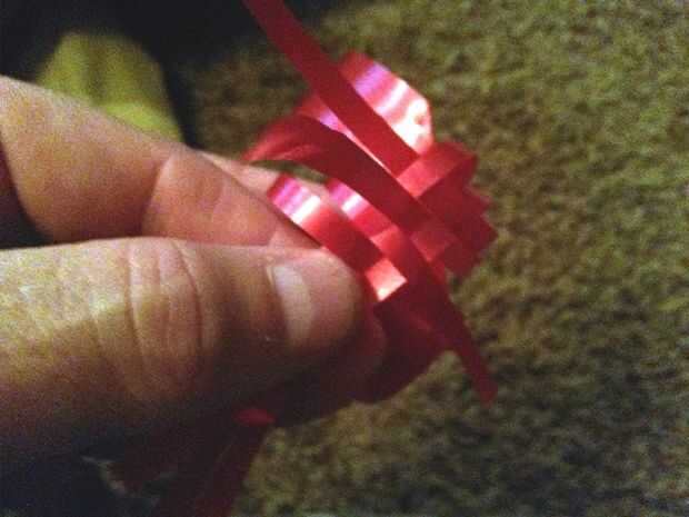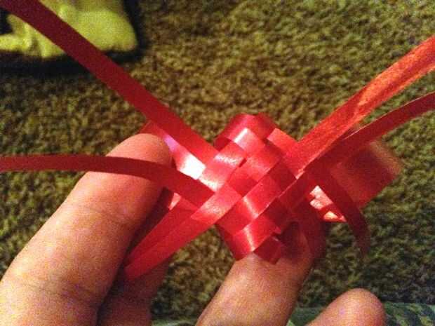 Ahora doblar el último conjunto de tiras diagonalmente en la esquina del centro justo detrás de las tiras del frente desde el lado opuesto y tejerlos en las otras tiras frontales cruzan que deben ser cuatro (dos al frente y dos de la parte posterior de lado opuesto.