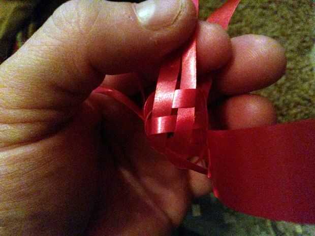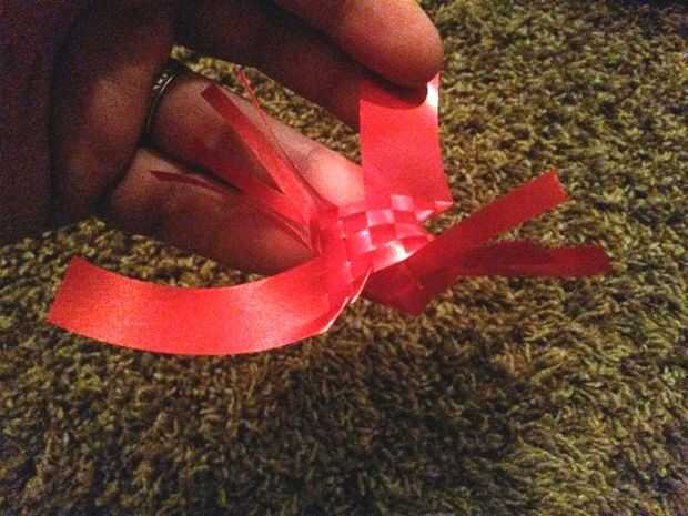 Se puede ver en las fotos donde los laterales están todavía abiertos y dos tiras extienden cuatro direcciones y hay cuatro conjuntos de lado abierto, dos en la parte delantera y dos en la parte trasera. Se tejen las tiras sueltas en estos lados abiertos más cercano a ellos.