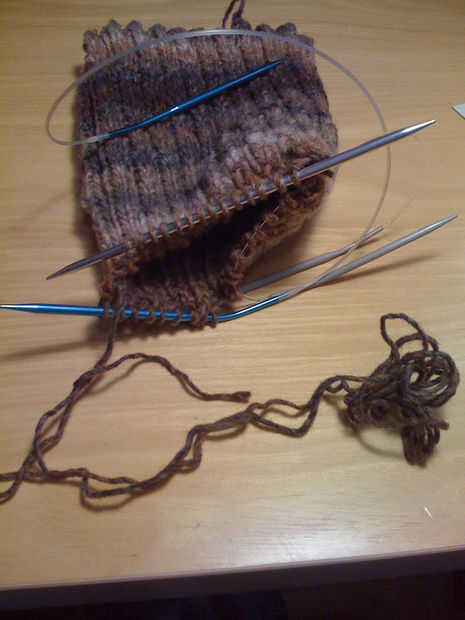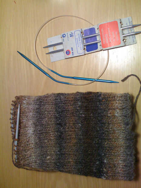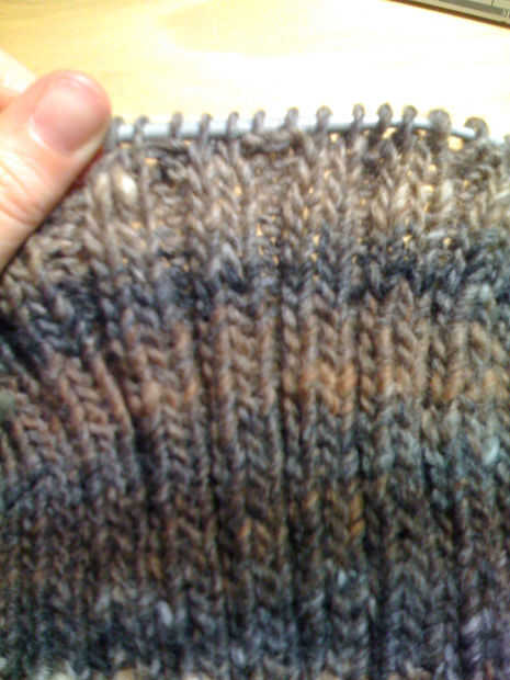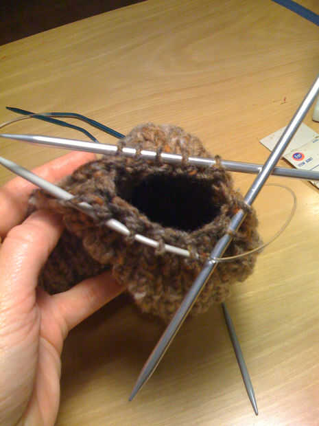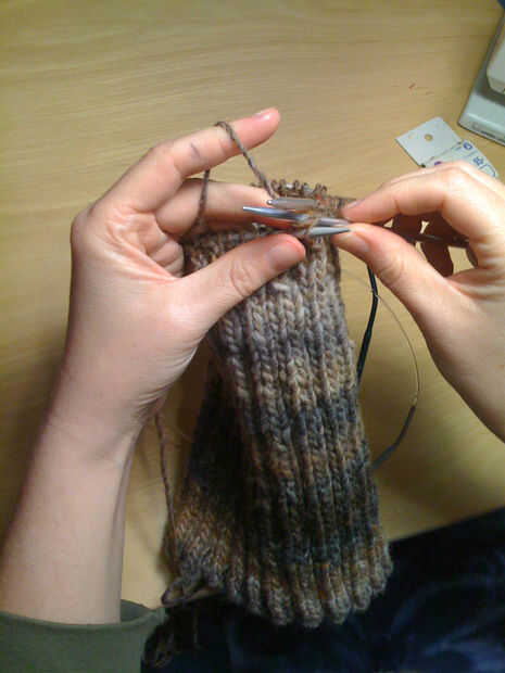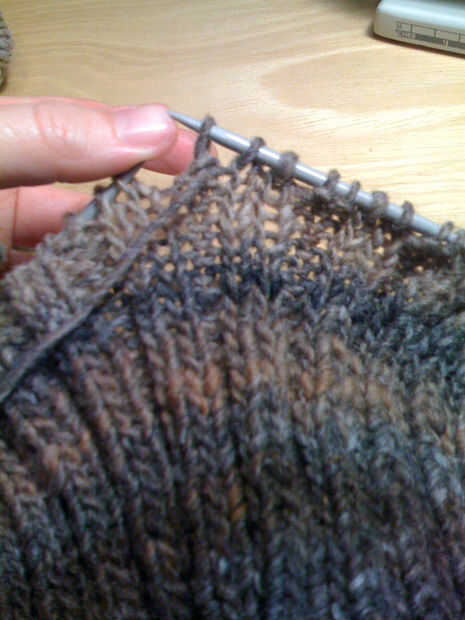 ¿Ver cómo va? Siguiente, punto 2 junto que cualquier otro elevado de la costilla (punto 5 º y 6 º). 2 alrededor de punto. El resto de los pares de punto para obtener una 1 x 1 costilla de punto. En algún lugar por aquí encontrarás las agujas circulares son demasiado grandes para el número de puntadas que tienes y querrás cambiar a doble-acentuado.
