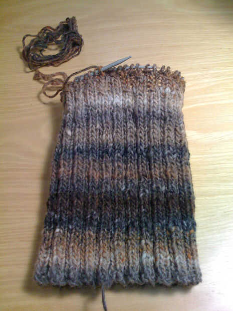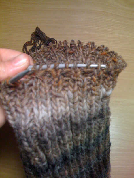 En segundo lugar disminuir fila: revés 2 juntos cada restantes 2-stitch 'zanja' o cada puntada 6 º y 7 º. Ahora estoy hasta las tres cuartas partes de mi original número de puntadas y un patrón de canalé 2 x 1.