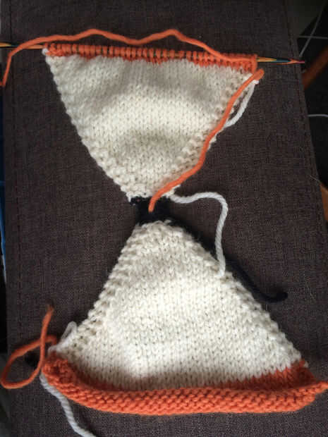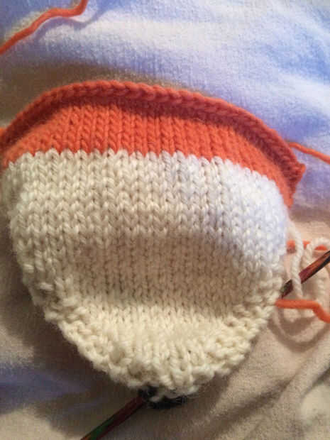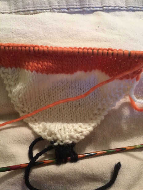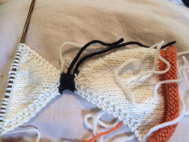 Repetir filas 5 y 6 hasta 33 puntos en las agujas. Cambiar al hilo naranja. Completa filas 5 y 6 una vez más darle 35 puntos en las agujas.
