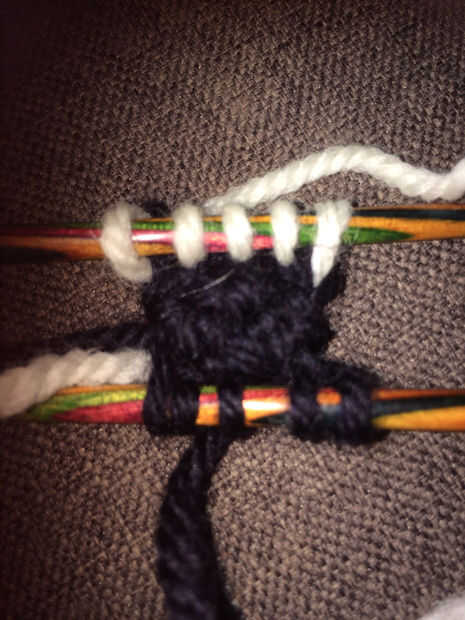 Molde de 6 puntos en color negro. 3 lugar en cada uno de 2 agujas como se muestra en la imagen. (Recomiendo casting en 7 puntos, a continuación, pasar el punto 7 de la puntada 1 para completar la ronda... sin embargo, esto es un poco complicado para principiantes, más fáciles con la práctica. El mismo resultado puede obtenerse por zurcir en sus extremos)
