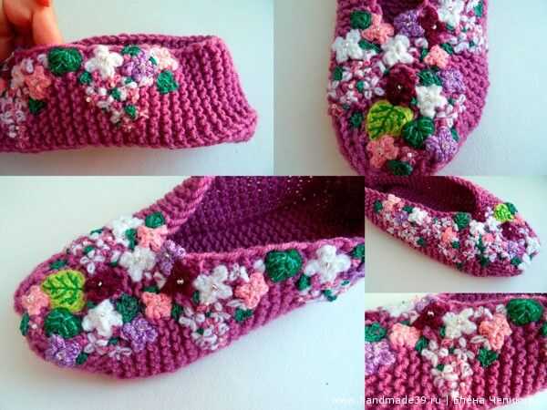 Coser los nervios de hojas verdes con contrastes de la pisada. Añadir cosidos 4 pétalos flores color lilas. Intentar montar en lila racimos. Coser una tira o un grano de semilla en el centro de cada flor. Mejor realizar la mayor parte del patrón en la parte exterior de cada zapatilla.