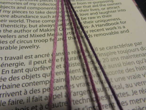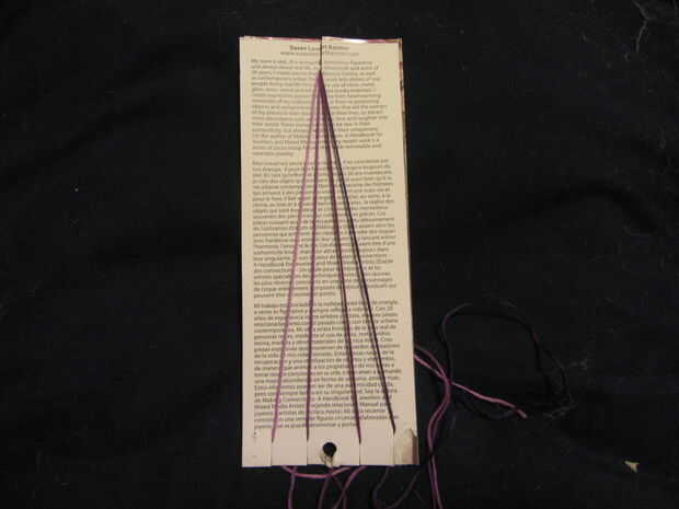 Deslice el extremo anudado por la ranura en la parte superior de la cartulina y deslice los hilos en las ranuras de la parte inferior. Asegúrese de ordenar según el patrón que desee. Izquierda a derecha se traducirá de arriba a abajo en tu pulsera. Arreglé que mi más claro a más oscuro para un ombre se vería.