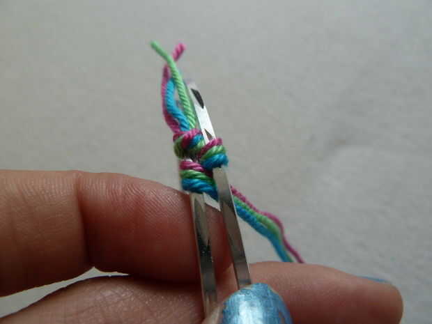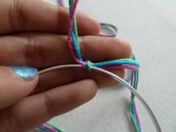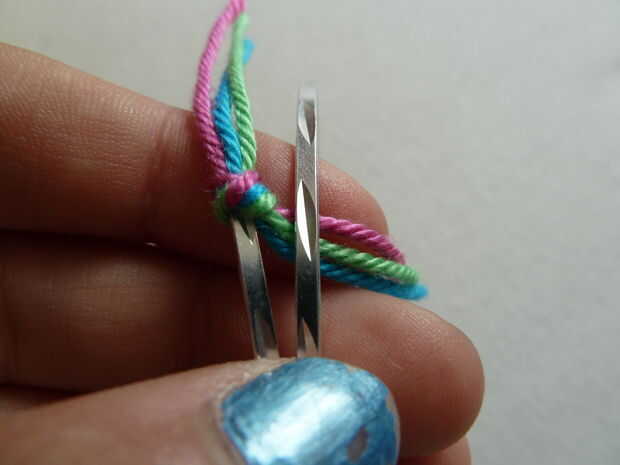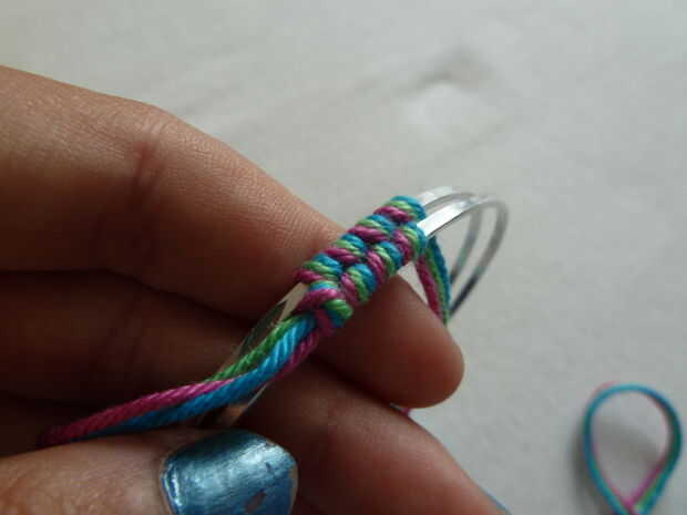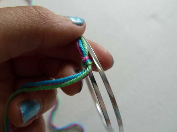 Luego tomar la otra pulsera y empezar a tejer la lana entre los dos brazaletes, va debajo y encima y debajo y sobre (o mira las fotos)