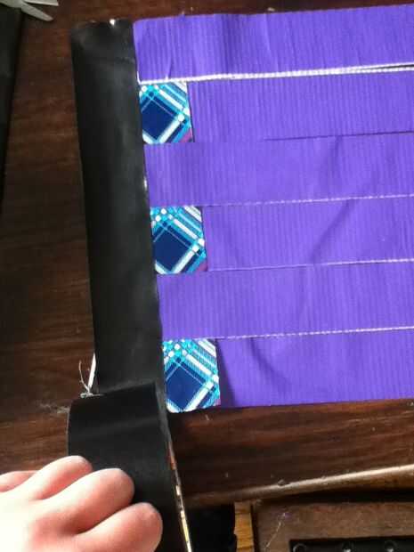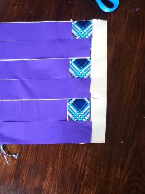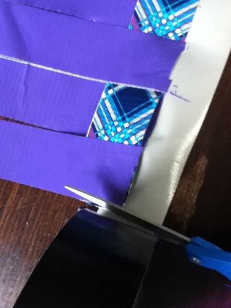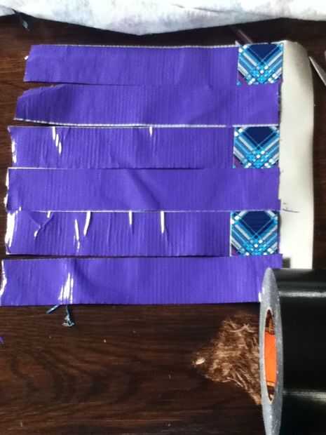 Tomar un color diferente en el paso 1 y 2 y se usa para cinta aislante los extremos juntos. No soltar el rollo en el pie como yo lo hice. Que lastima. :(. A continuación, levante cuidadosamente todas piezas de cinta de conducto voltear al otro lado y cortar la tira de cinta de conducto mientras todavía se une a las otras tiras. Levante el lado pegajoso de la cinta y presione las puntas de las tiras de cinta de conducto.