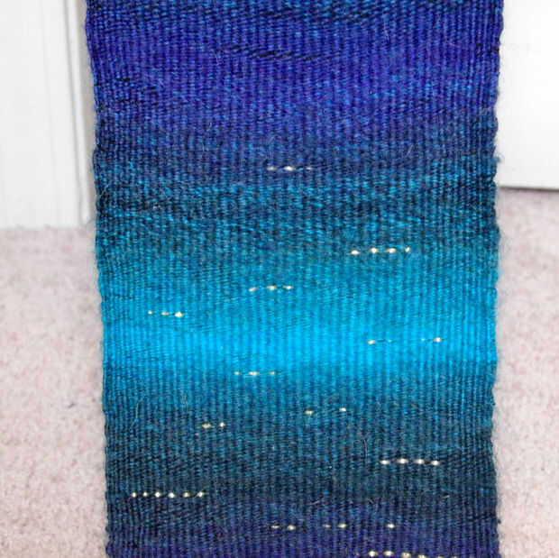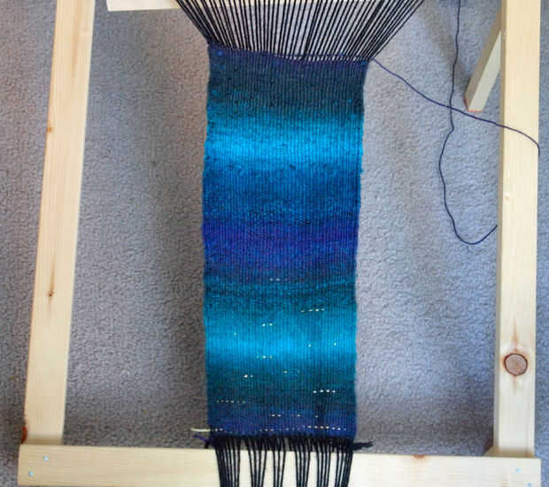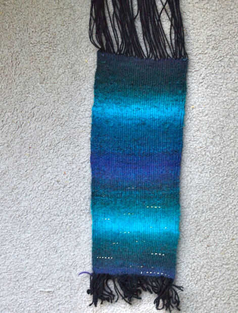 Realmente había comenzado este hace un tiempo y no me tomo fotos cuando comencé hacia fuera.  Usé mi telar de bastidor y tejió una pieza que era 40cm de largo y 16cm de ancho.  Utilicé una técnica básica, nada extravagante aparte intercalando algunos filamentos de cinta dorada en lo que sería el frente de la cartera.  Al quitar la pieza del telar dejé los stands del hilado de deformación mucho para que pudiera usarla como un flequillo.