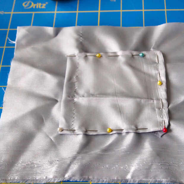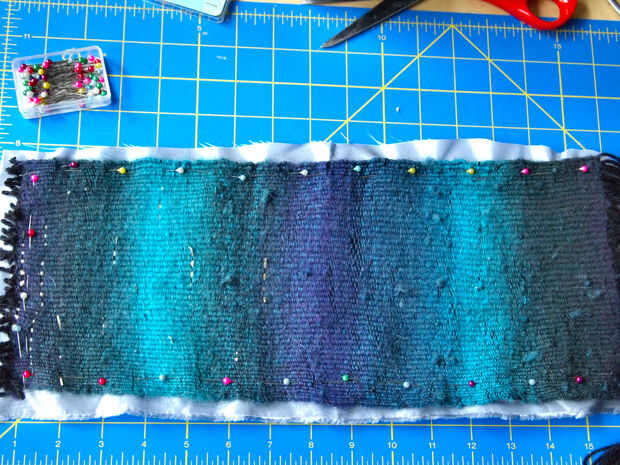 • Puse la pieza tejida sobre la tela de forro frente a frente y fijado en lugar