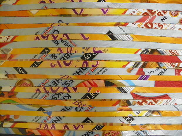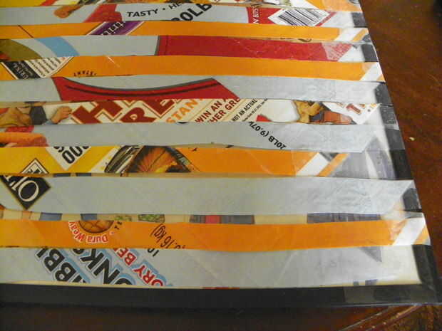 Graba las tiras a un marco de gran cartel. Cinta por ambos extremos de cada tira. Llene el marco entero. Coloque las tiras como cerca uno del otro como sea posible sin superponerse.