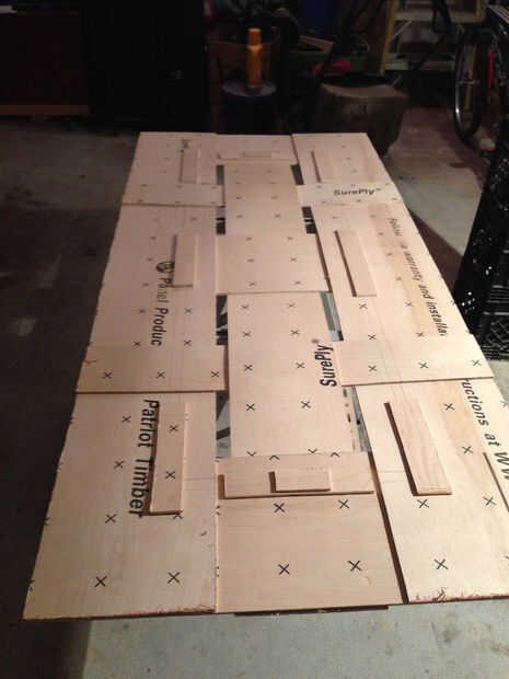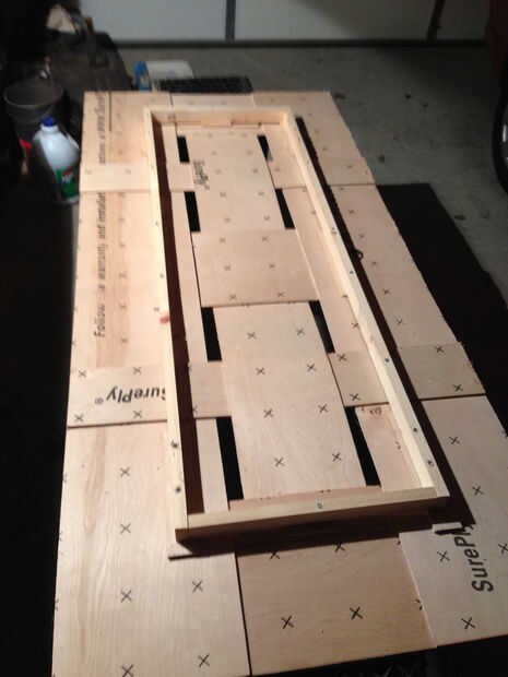Pegar las piezas de 5"-ish en la parte posterior de la madera para hacer una superficie nivelada para colocar el marco. Usted necesitará 2 en los extremos de la pila. Deje secar durante al menos una hora.