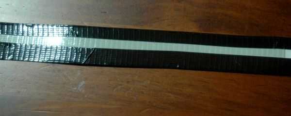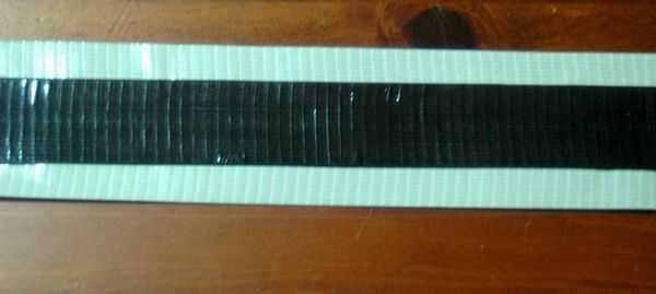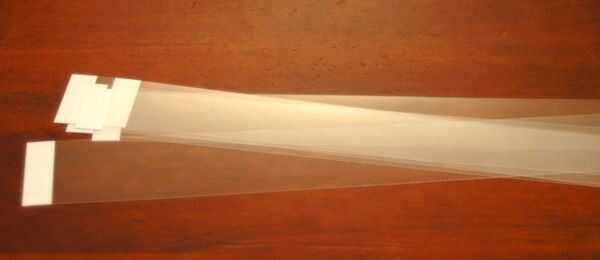 Con cuidado corte una longitud de cinta que es igual a la longitud de la correa que desee. Sin permitir que se doble o se pegan a sí mismo, pone lado pegajoso hacia arriba. Coloque las tiras de transparencia por la mitad, superpuestas por lo que no quedan huecos. Doblar los bordes. No se cubren completamente la transparencia.