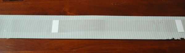 Para hacer una correa resistente, me gusta cortar tiras de 1" de transparencias (la clase usada en proyectores) para dar forma y fuerza. Corté tiras de 5 (11" largo cada una).