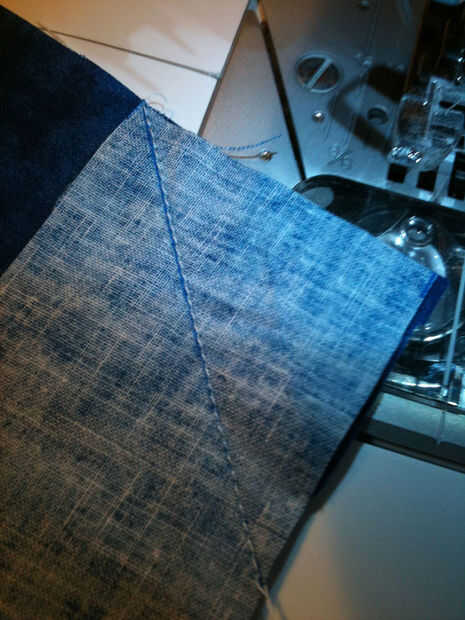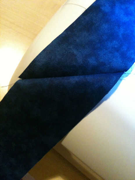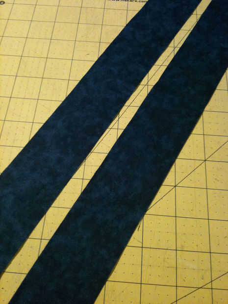 Con una tela de diferente color para los bordes, cortarlas en tiras de 2 pulgadas. Te necesito suficiente material para ir todo el camino alrededor de la colcha con 6-8 pulgadas para repuesto. Para hacer esto, me voy luego coser juntos en ángulo recto y coser 45 grados por lo que es una costura diagonal. A seguir haciendo esto hasta que tenga suficiente tejido para ir alrededor de la colcha.