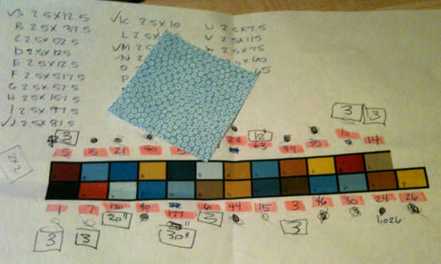 Para saber rápidamente cuánto tejido te necesito, te tomar el ancho del rollo de tela, en la mayoría de los casos, 44 pulgadas y hacer algunos cálculos rápidos y saber que puedo conseguir plazas de 2,5 pulgadas (17,6) por ancho. Por ejemplo, si necesito 63 plazas, había dividido por 17.6 que es 3,57 filas. Te alrededor de un máximo de 4. 4x2.5 es 10 pulgadas de tela. Cuando luego he cortarlo, lo completan lo otra vez a 12" por si acaso.