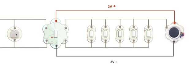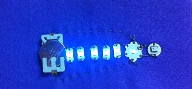 Usando el kit de sensor de los sonidos del Anio, cosí el sostenedor de batería, sensor de los sonidos, la chispa según el diagrama suministrado con el kit. http://www.aniomagic.com/Sparkle/Sensors.php