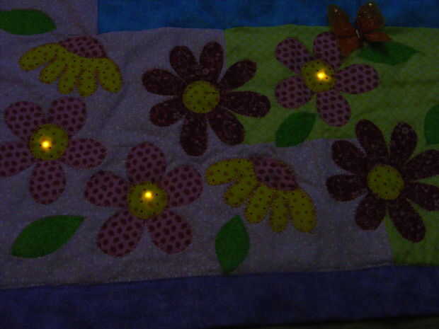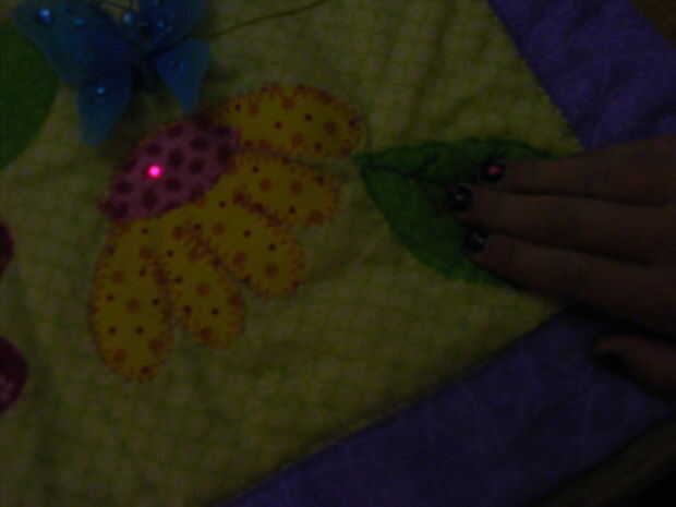 Esta colcha es un juego de luz roja luz verde completamente funcional.  ¿Qué es la luz violeta, pregunte? Disco! Cada luz se enciende al azar de una cantidad aleatoria de tiempo. Si la luz roja está encendida y un jugador se mueve, la colcha detecta