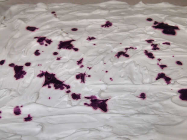 • Caída de la tela dye(s) uniformemente a lo largo de la superficie de la espuma, añadir varios colores si desea.  He utilizado predominantemente púrpura (púrpura de RIT 13) y un poco de azul (RIT noche azul 27).