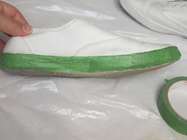 • tenemos que quitar los cordones y cubrir los bordes del plástico. Cinta de pintor trabaja bien a cubrir las llantas y levanta bien durante el enjuague en el paso 9.  Asegúrese de que esté que todo cubierto incluyendo el labio donde confluyen la lona y el plástico.