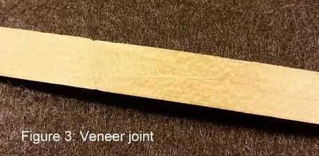 Problema #3 - en el proceso de decapado de la madera hacia abajo, usted probablemente descubrirá unas tiras que se han unido juntos - sobre todo si se utiliza un rollo de chapa preencolada como lo hice. Usted no podrá utilizar estas tiras, así que reemplazarlas con piezas que no tienen una articulación y ponerlos con el tratamiento anterior. La figura 3 muestra el zig-zag común donde dos tiras de chapa se han unido para hacer una tira más larga. ¿Puedes verlo? El proceso de remojo la chapa en aguarrás y hervirla en agua debilitará estas juntas por lo que eventualmente (o inmediatamente) fallará. Ya que sólo tienes ocho 12" largo las tiras de chapa para el proyecto y un rollo de chapa de 3/4" de ocho pies es suficiente para producir 16 tiras que usted tendrá un montón de sobra.
