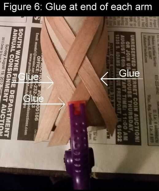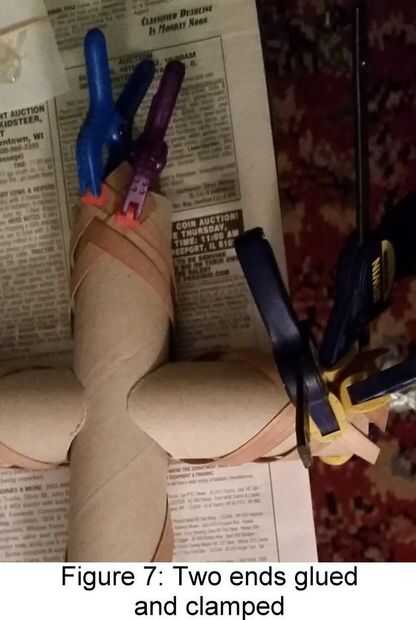 Tomar el palillo y aplicar epoxi entre las capas de chapa en cada una de las tres intersecciones donde terminan las tiras (no es necesario a la intersección que no está en el extremo de las tiras del pegamento). Vea la figura 6. Intente muy duro no conseguir cualquier epoxi en cualquiera de la madera que se enfrentan hacia el exterior o en el formulario. Utilice una pequeña pinza para sostener cada intersección pegado en su lugar. Desde la parte superior e inferior del formulario están abiertas, puede utilizar las abrazaderas de muelle simple al hacer esos extremos. En los dos brazos que están cubiertos por los discos de madera que deberás usar una mini pinza que puede abrir suficientemente ancha como para sujetar alrededor del diámetro entero de 1 1/4 de pulgada de la forma (Figura 7). Deje que el pegamento secando.