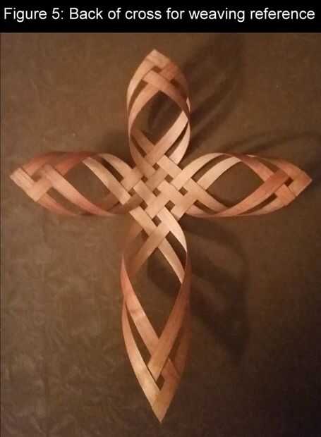 Usted estará trabajando desde la parte posterior de la forma para este paso, así que utilice la imagen de la Cruz de la parte posterior (Figura 5) como una guía para tejer los extremos de las tiras.